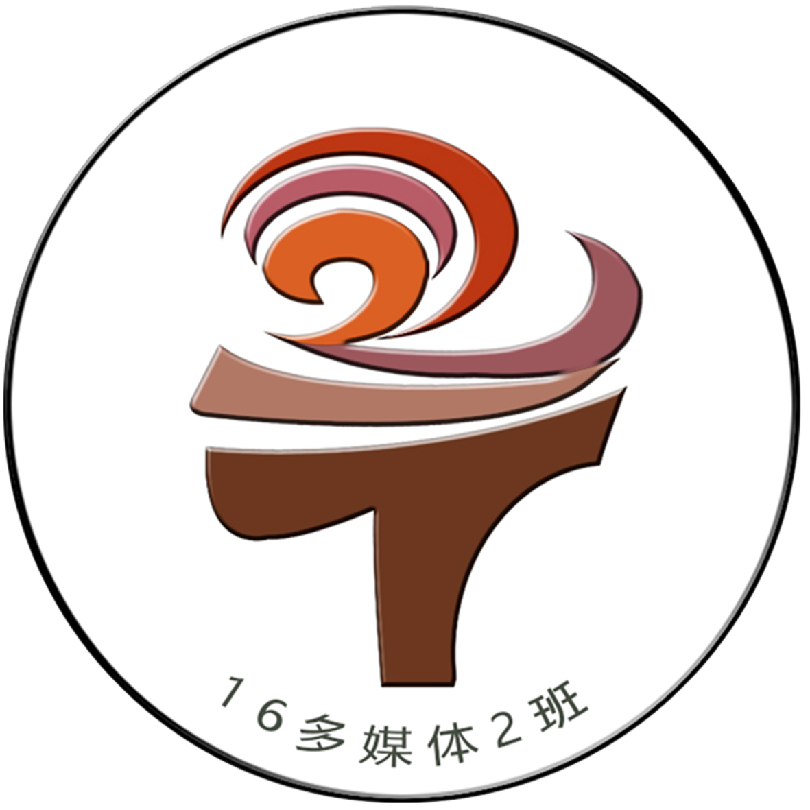 16多媒体2班的班徽设计说明:此班徽主要以圆为背景,可以看出这个班的大团结,表明了这个班是一个和谐、快乐、温馨的大家庭。中间班徽是个的抽象的“火炬”形状代表着我们的班级积极向上的气氛和必胜的决心和信心。“火炬”的形状也是“DMT”三个字母的抽象形状,代表着我们的专业“多媒体”。而上部火焰部分也构成数字“2”,代表了我们的班级——二班。