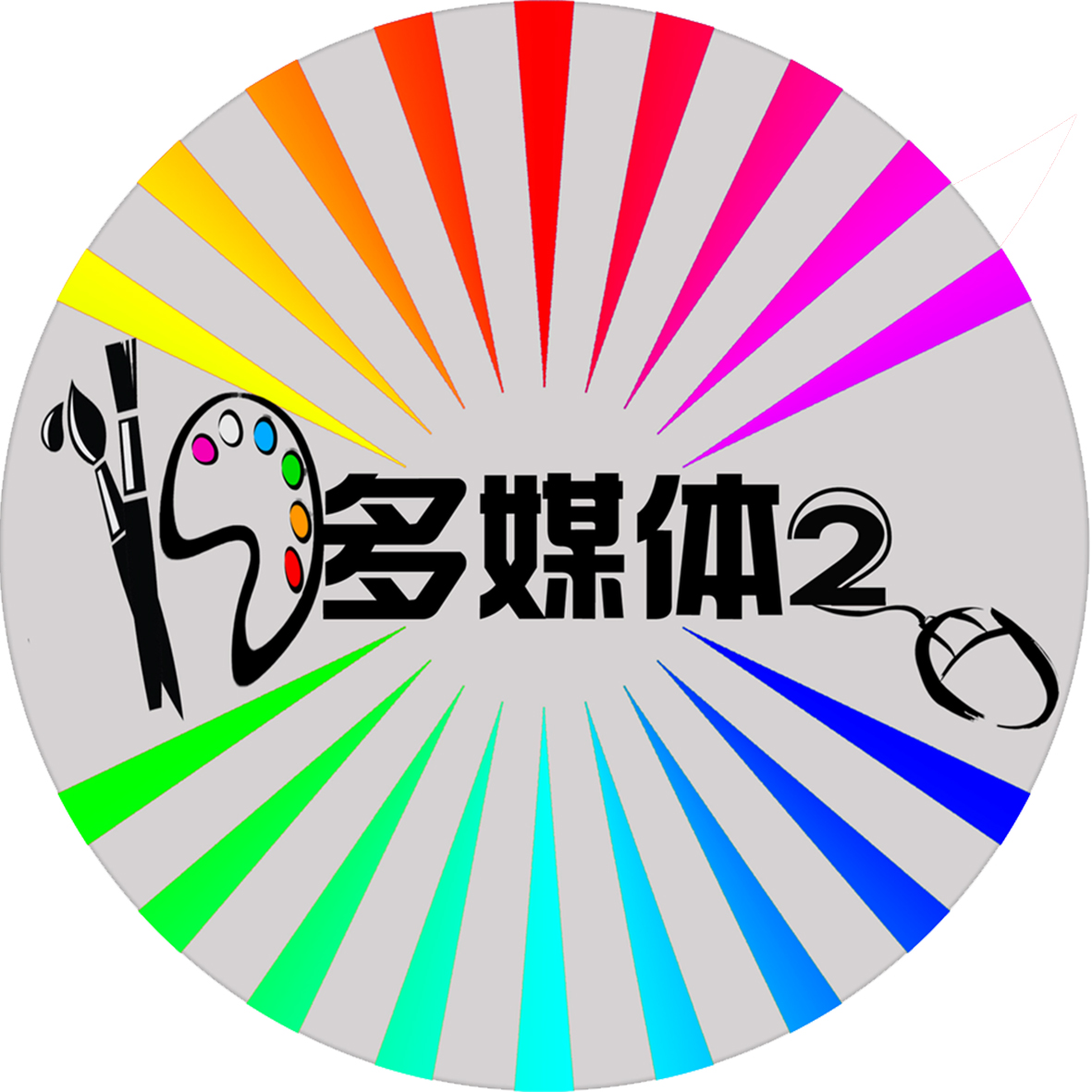 17多媒体2班的班徽设计说明:班徽的主体图案呈现圆形,采用画笔、调色板和鼠标等多种元素进行组合,充分表现了数字媒体的专业特色。数字“17”使用具象的图形表示,趣味性强。色彩灵感来源于光盘在阳光下产生的多彩渐变色,喻意用手中的画笔创意七彩人生,同时希望17多2的孩子们阳光、健康、快乐。