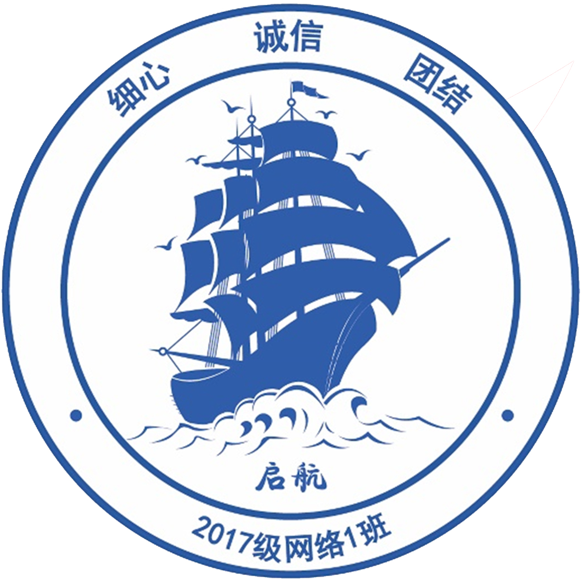 17网络1班的班徽设计说明:班徽上方是我们的班训,下方是我们的班名,图形中央是一艘帆船,象征同学们乘风破浪,在知识的海洋中遨游。让我们勇往直前,永无止境。班徽采用蓝色,代表全体同学,紧紧的团结在一起,怀着大海一样的胸怀,同舟共济,努力拼搏,在知识的海洋里,扬帆起航!