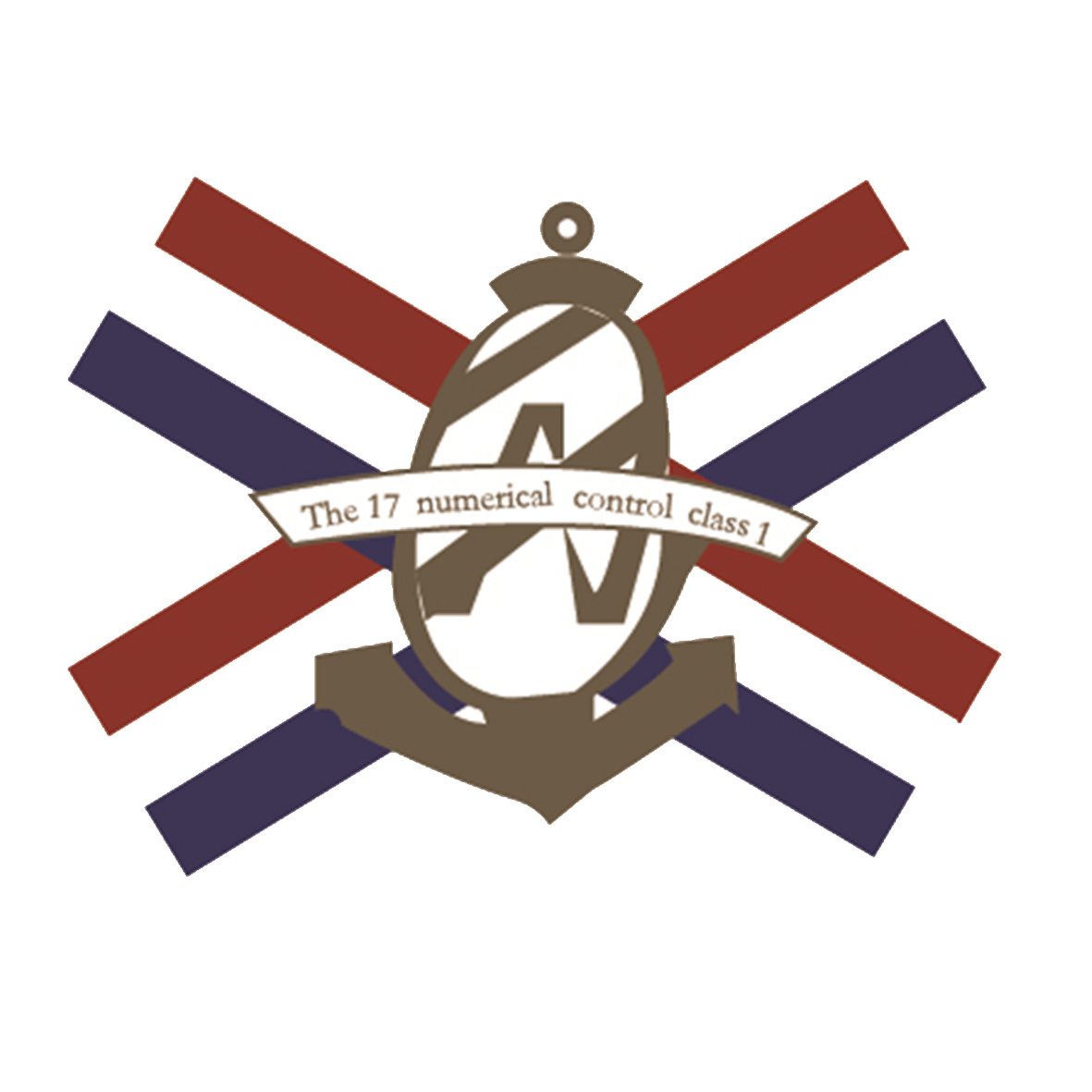 17数控1班的班徽设计说明 :最外面是大写的c,c里面有一个n,NC是数控的英文简写,最外面是一个船锚,象征着踏实,稳定,团结一致。徽章样式参考了英式勋章和肩章,红白蓝三色分别代表自由,平等,博爱。在徽章的最中间是17届数控1班的英文全写。