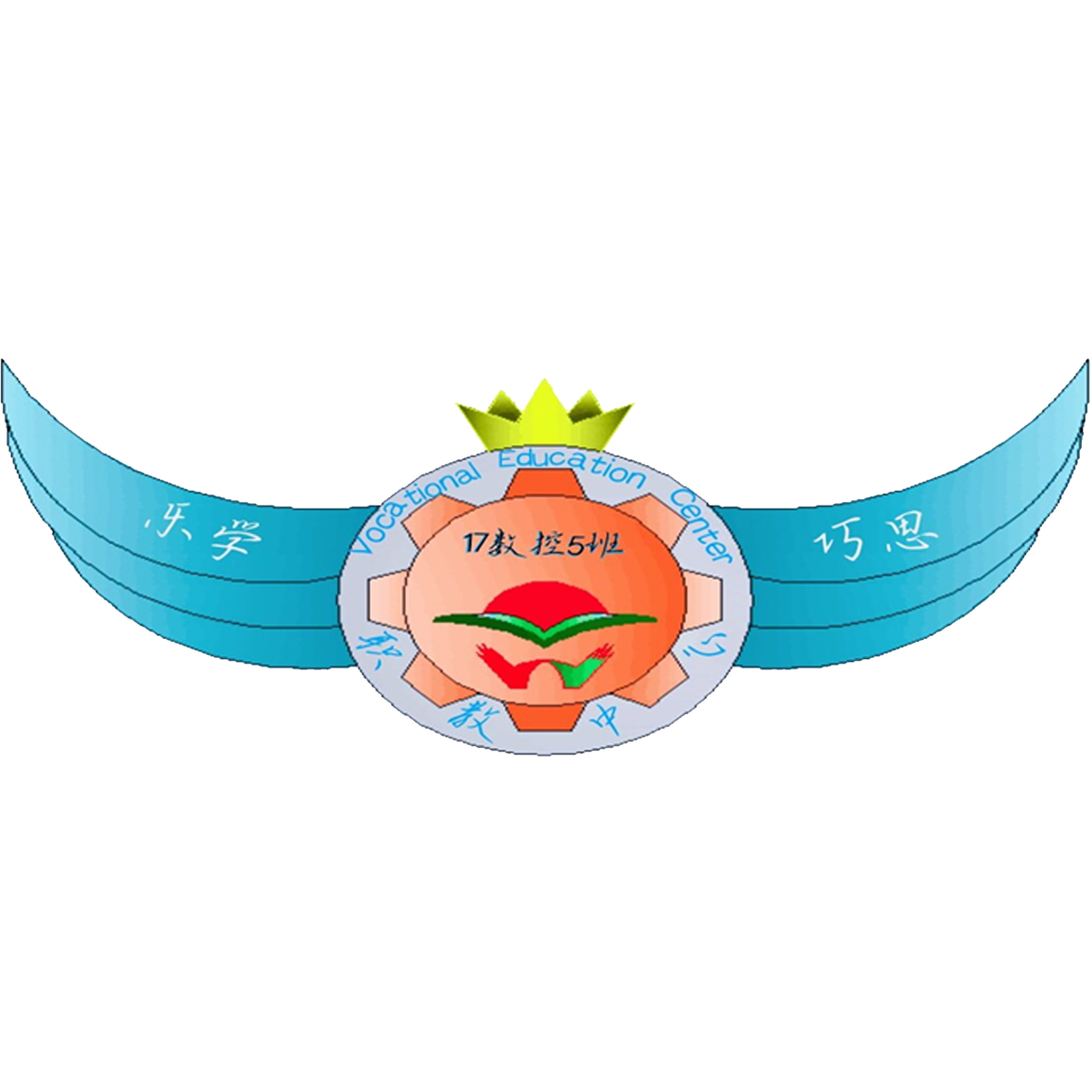 17数控5班的班徽设计说明 :翅膀班级名称代表飞的高,飞的远;上边皇冠代表最后的成绩;英文字母代表职教中心;齿轮代表数控专业;下边双手托书,中间太阳,代表只有学习,乐学巧思,才能心中明亮,走向成功!