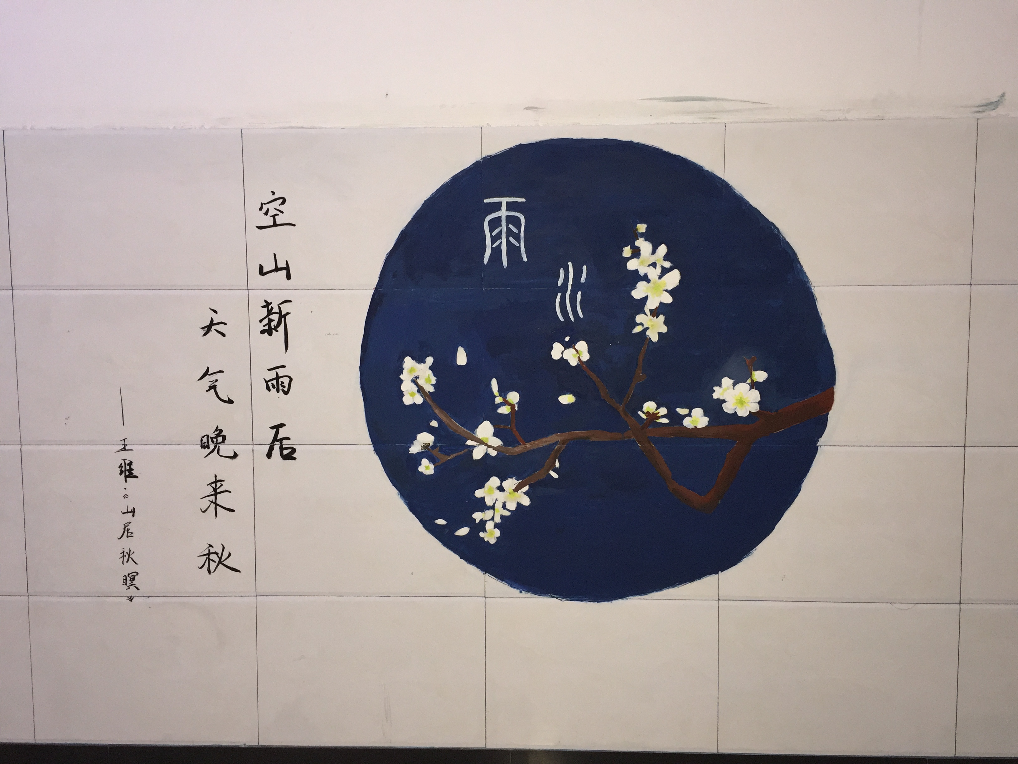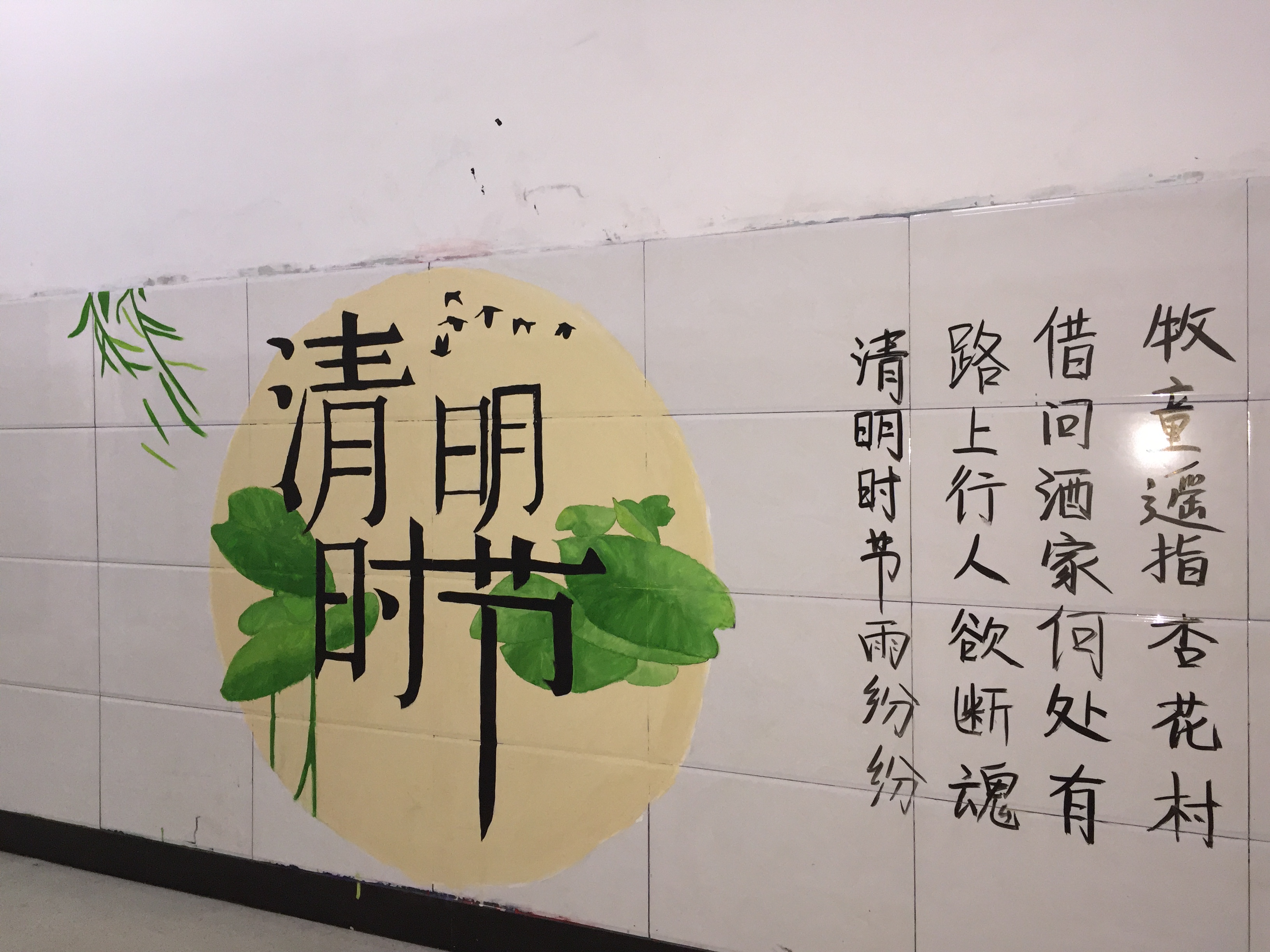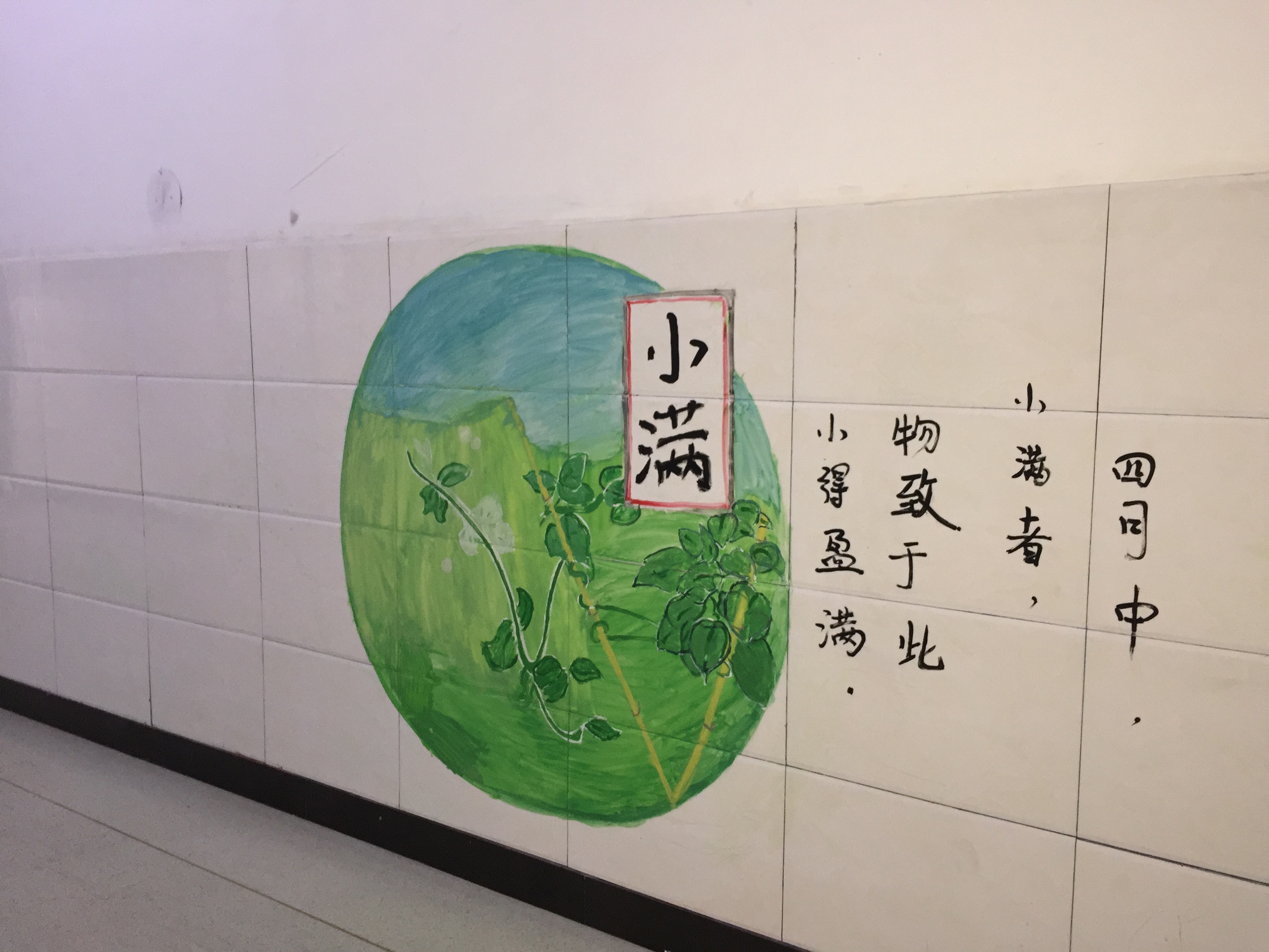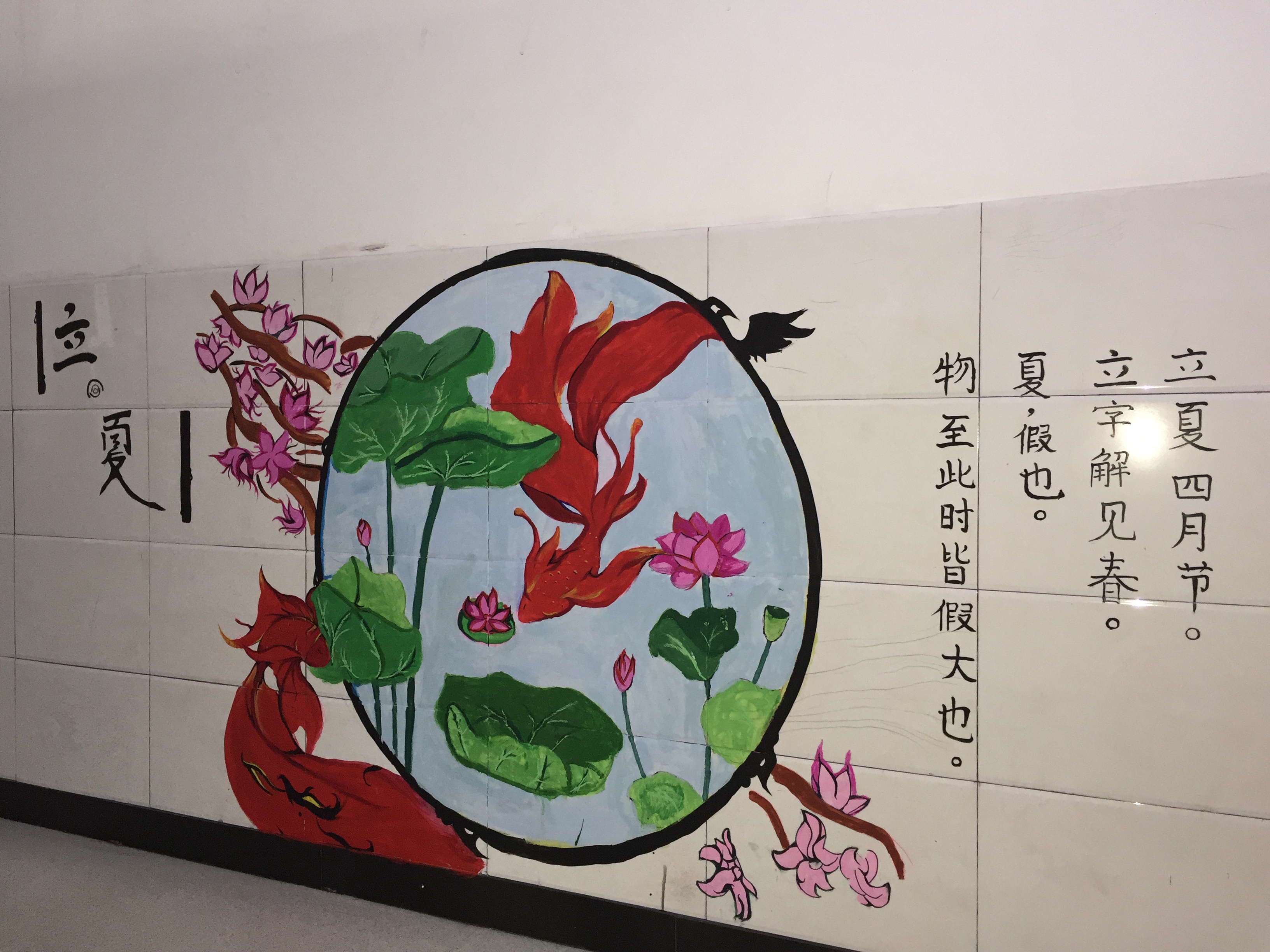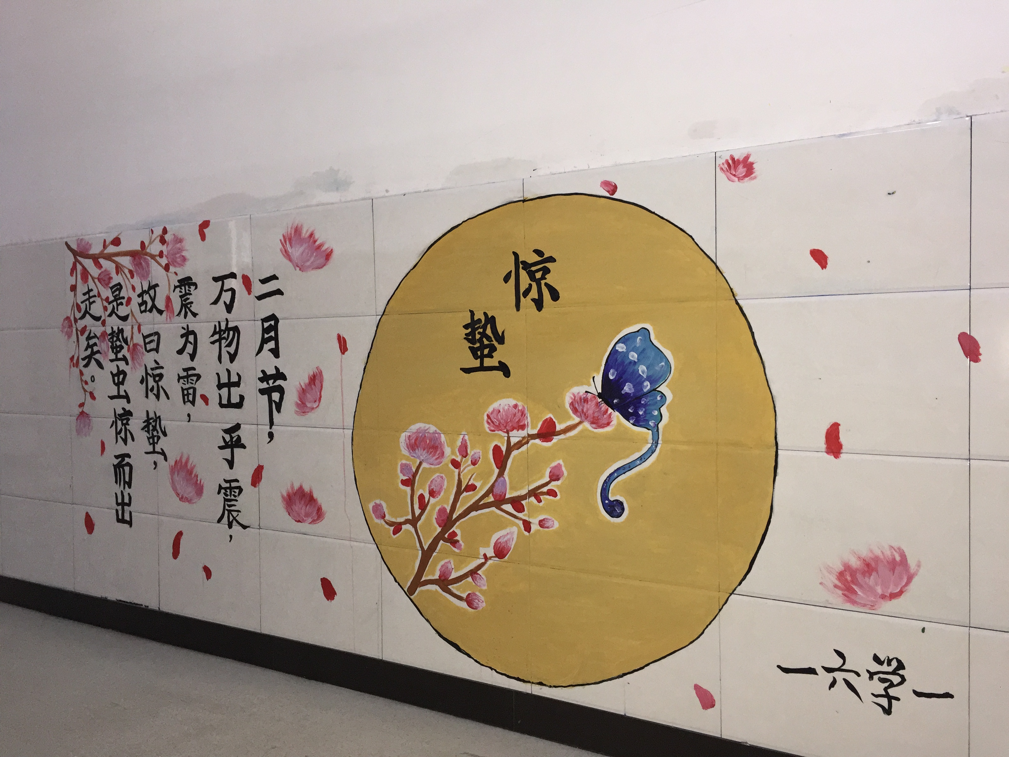 在学前教育系走廊和楼梯墙上,学生精心绘制的一幅幅美丽的图画配有恰到好处的诗文四处可见,静心凝视,便感觉到了一种清新明艳之美。学前教育系学生充分发挥专业特长,细心勾勒,精心上色,将富有中国传统内涵的二十四节气活灵活现地展现在全校师生面前。