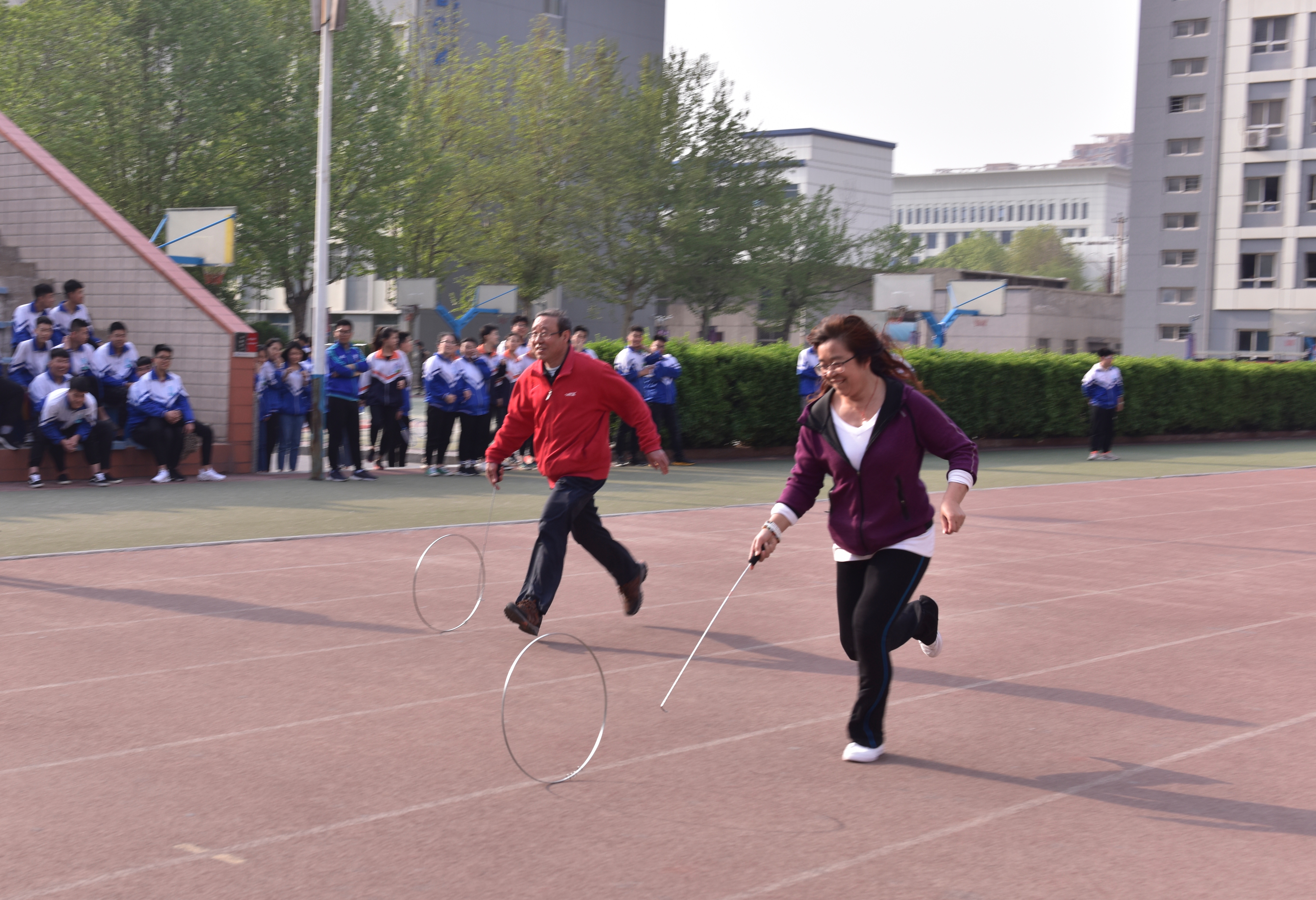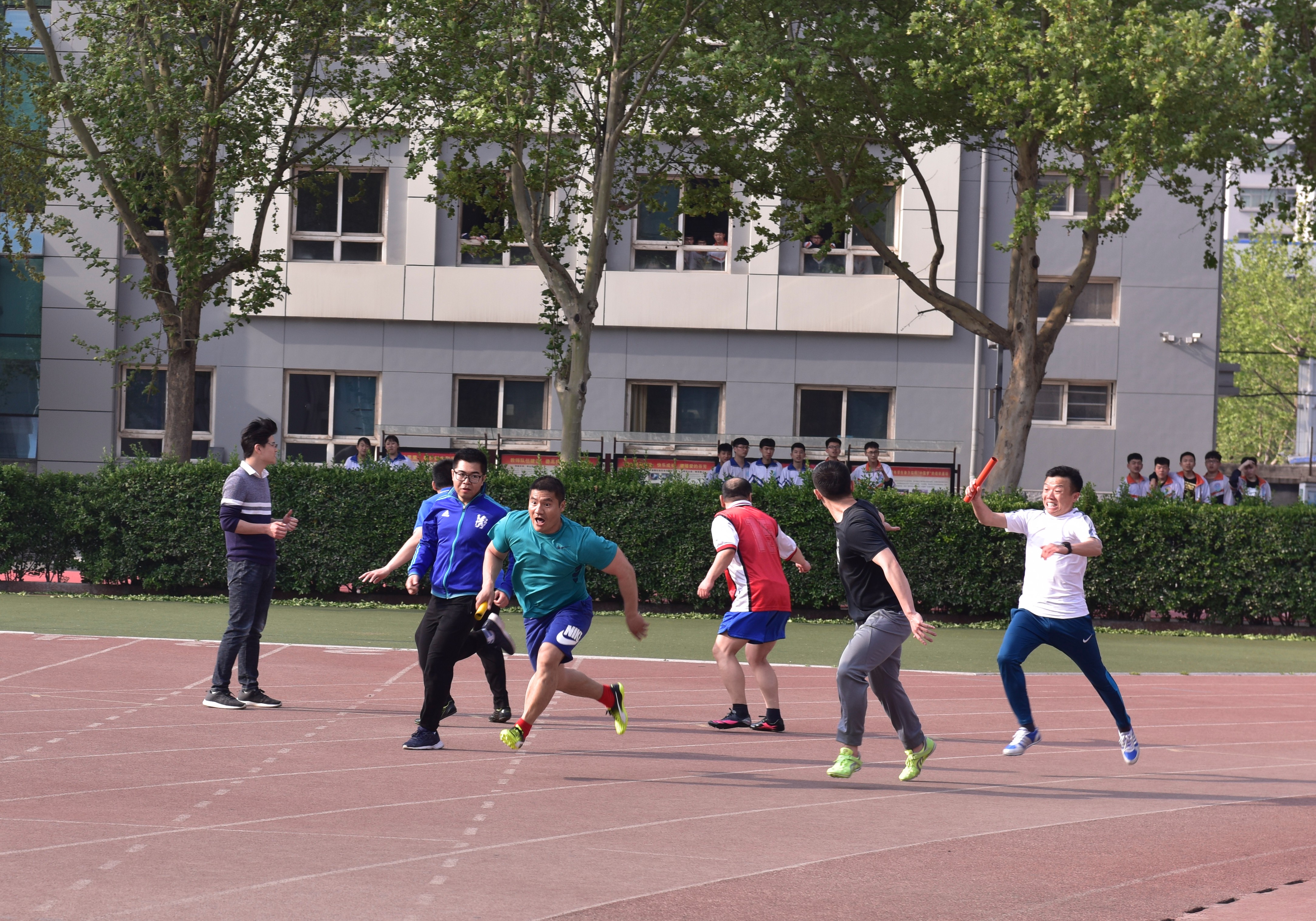 本次运动会分为四个团体比赛项目,分别是4*100米男、女教工接力赛、8*50米跳绳接力赛、8*50米运球接力赛、8*50米推铁环接力赛。