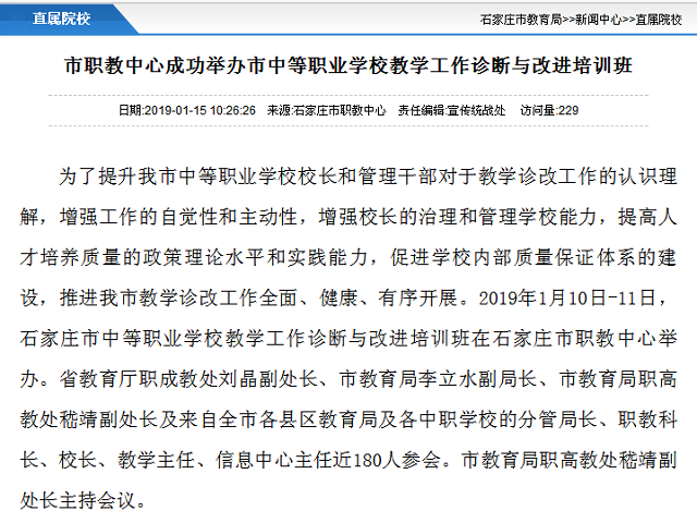 根据石家庄市教育局职高教处工作计划和石家庄市三支队伍培训工作安排,经研究决定,在2019年1月10日-11日,在市职教中心举办我市中等职业学校教学工作诊断与改进培训班,通知如下:
