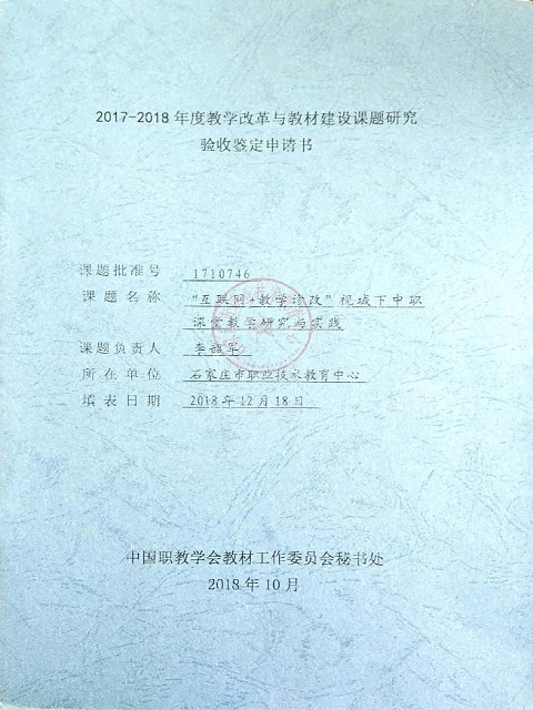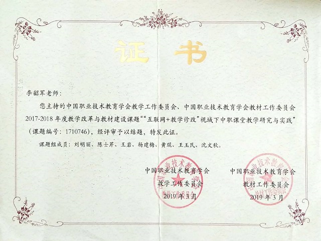 二〇一七年五月,经中国职教学会教学工作委员会、教材工作委员会批准,李韶军老师申报的 “互联网+教学诊改”视域下中职课堂教学研究与实践课题正式立项。该课题批准立项以来,课题组研究团队分工合作,努力工作,严谨治学,严肃认真开展课题研究与实践,圆满完成了研究目标,并取得了较为丰硕的成果。