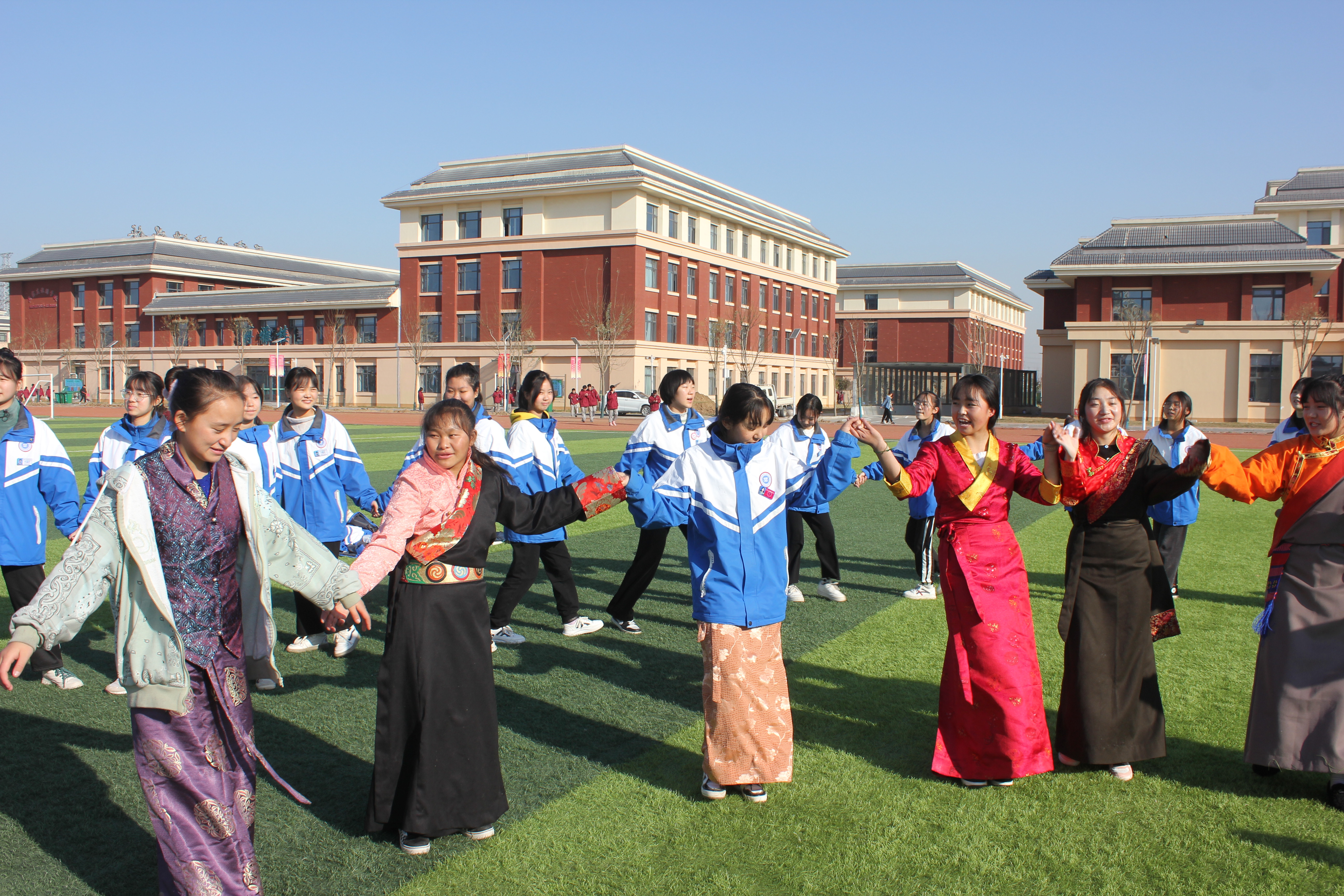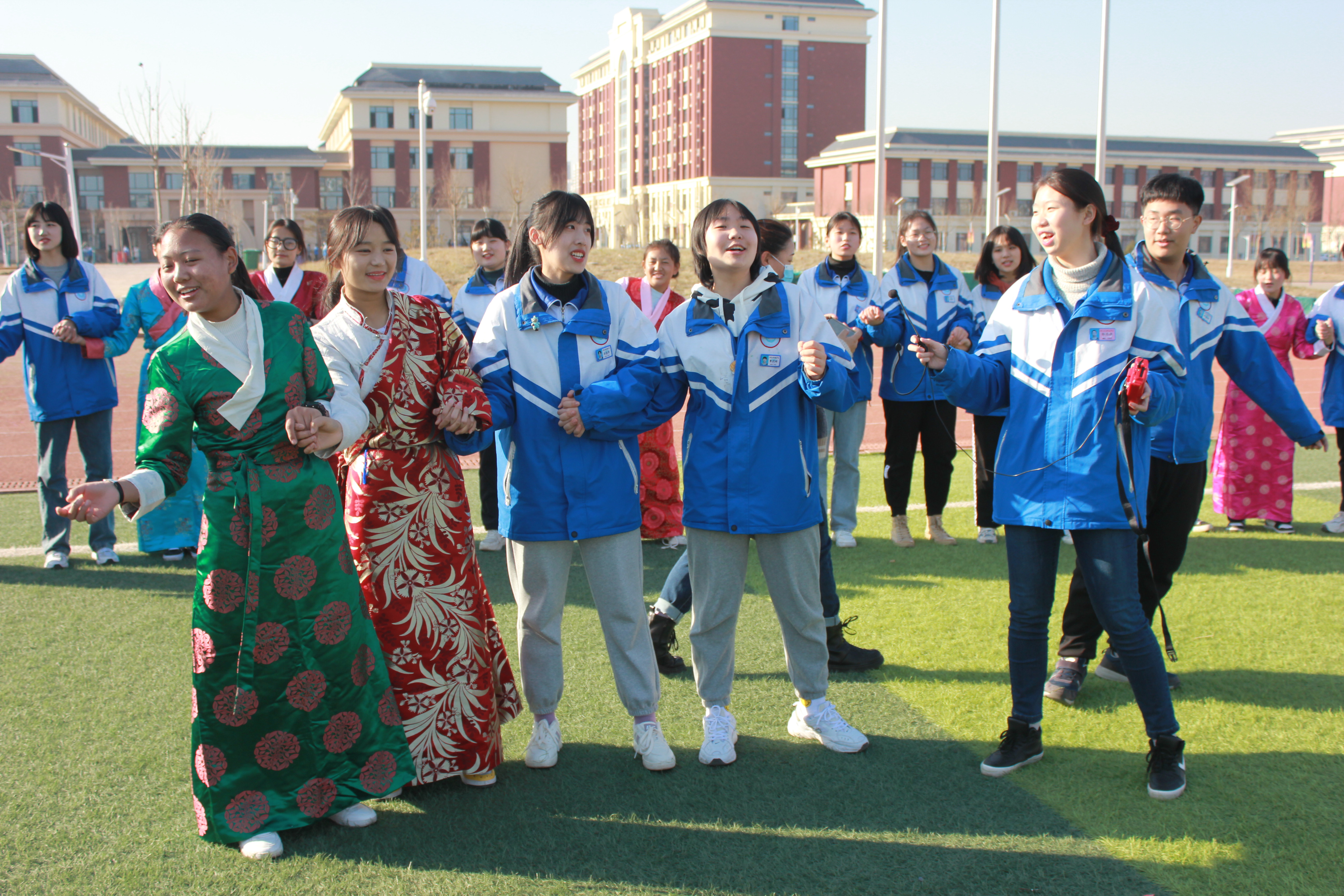 藏族与汉族的同学手拉手跳锅庄舞